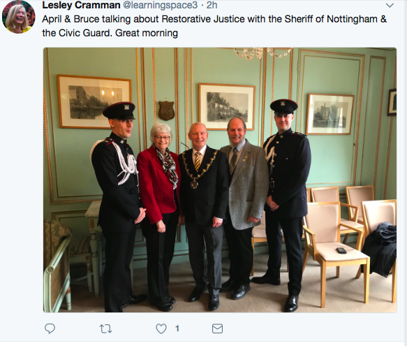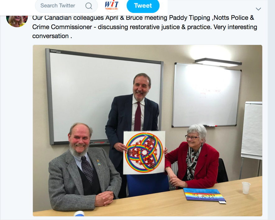 April is in the UK to visit colleagues, share expertise, and complete a learning exchange. Because of interest from visits to BC 18 months ago; April and Bruce Curtis (who work together in a regional network to design, produce and mobilize anti-racism, anti-homophobia and anti-hate awareness, change and capacity building programs) met and talked to the 794th Sheriff of Nottingham (Counselor Glyn Jenkins); Police Commissioner and ex-MP Paddy Tipping. Topics included Bruce’s provision of Restorative Justice at the Comox Valley Community Justice Centre, and April’s use of restorative practices across sectors and disciplines (Being Least Intrusive tool, Promising Approaches in prevention of violence, community capacity building, leadership development).